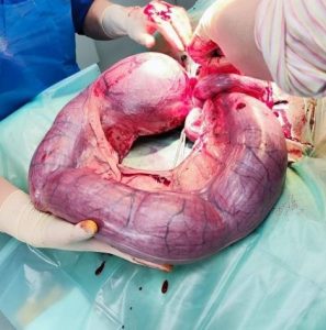 Hier sieht man einen 4 kg schweren entzündeten Uterus einer Bernhardiner Hündin.
